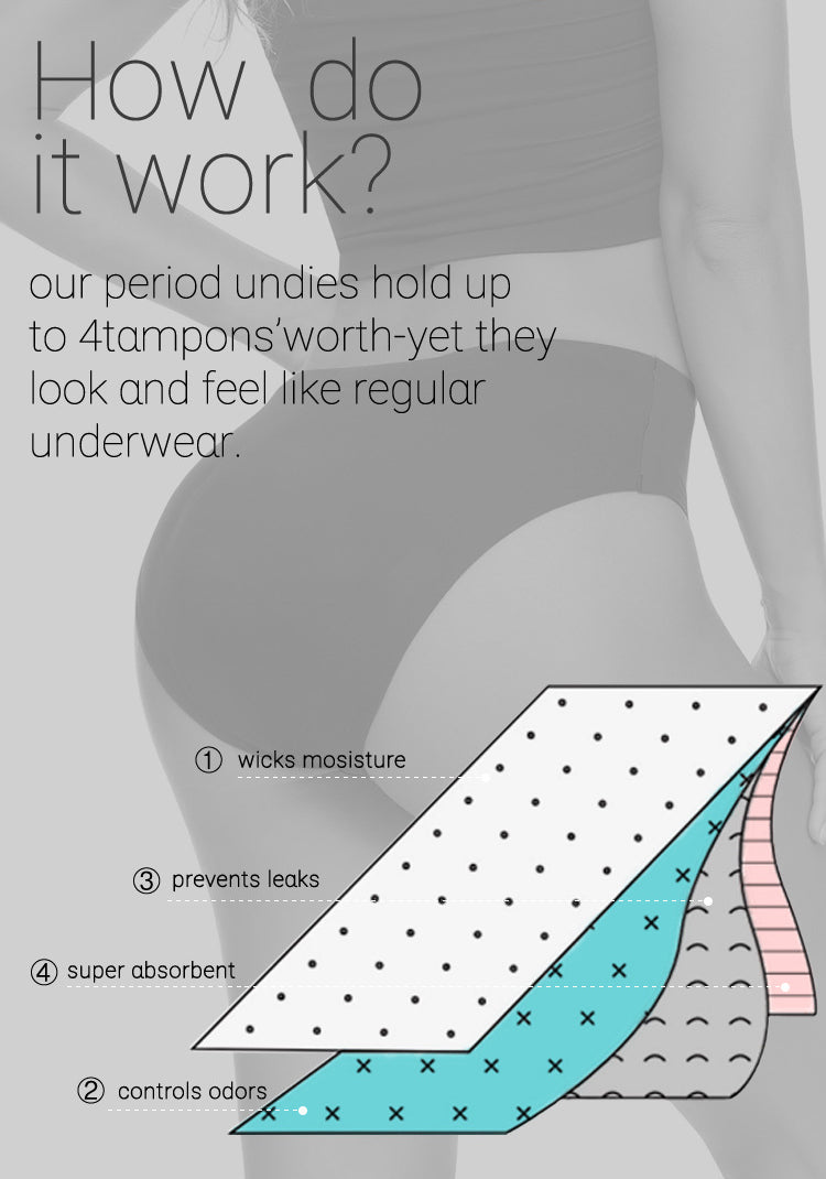 Our Period Panties has an integrated absorbent liner which prevents leaks and helps you stay dry during your period. She absorbs the equivalent of 3 to 4 tampons to offer you up to 12 hours of protection.