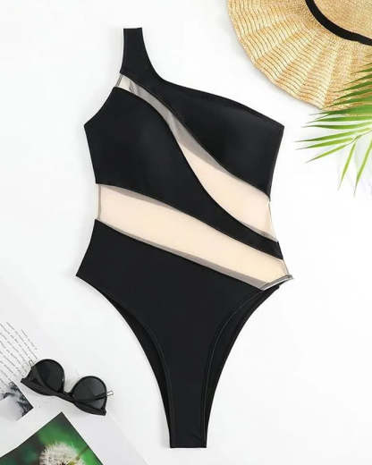 Beach Vacation Off-shoulder Transparent Mesh Colorblock Sexy One-piece Swimsuit
