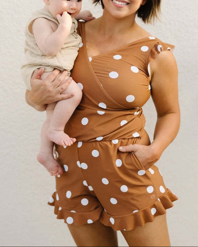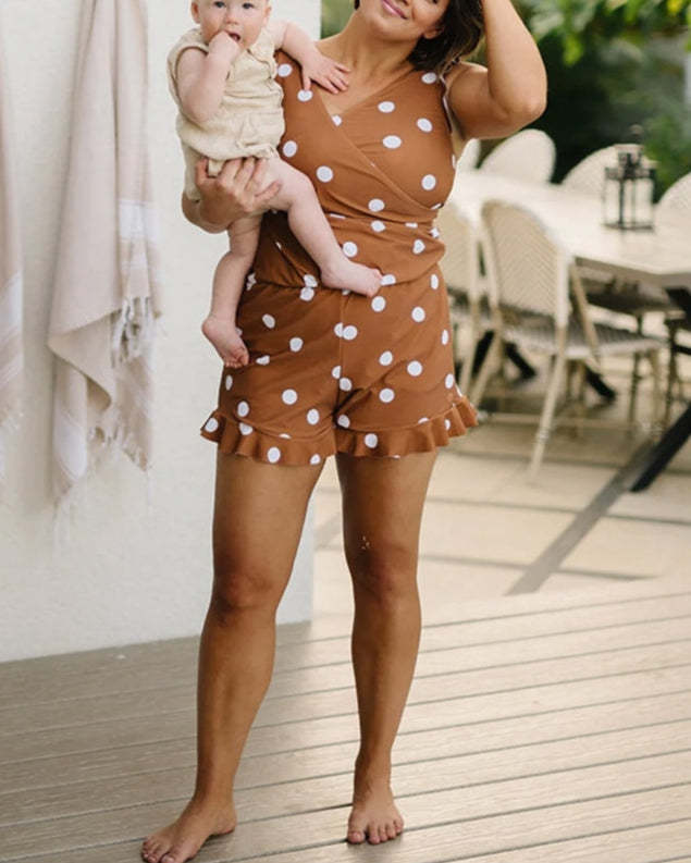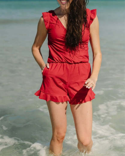 - With crossed v-neck. ruffle shoulder and hem design. nursing-friendly for moms and create a flattering look in style. ruffled sleeves and shorts come for a sophisticated take on a tropical-inspired look.
