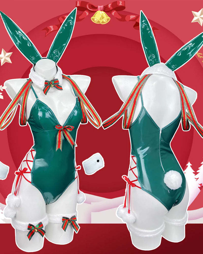 Unwrap a festive fantasy with this daring Christmas-themed bunny girl set. Crafted from sleek faux leather and accented with playful holiday details, this ensemble blends classic cosplay charm with provocative seasonal style. Designed to hug your curves, it’s the perfect outfit for spreading holiday cheer with confidence and allure.