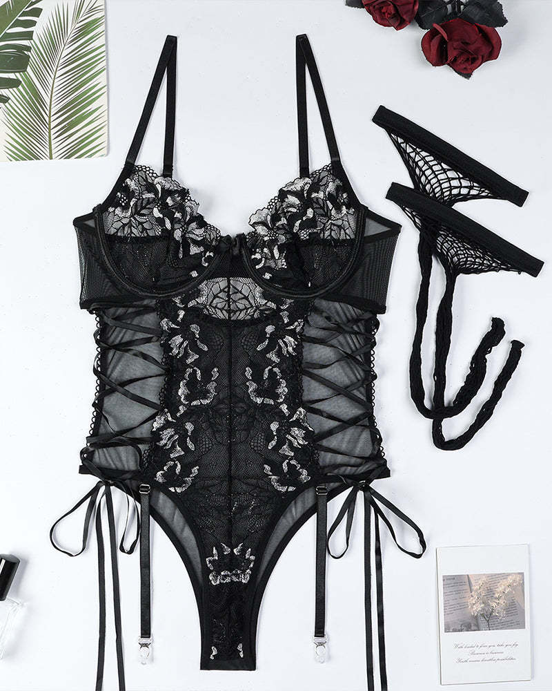 Criss Side Tie Sheer Floral Lace Bodysuits