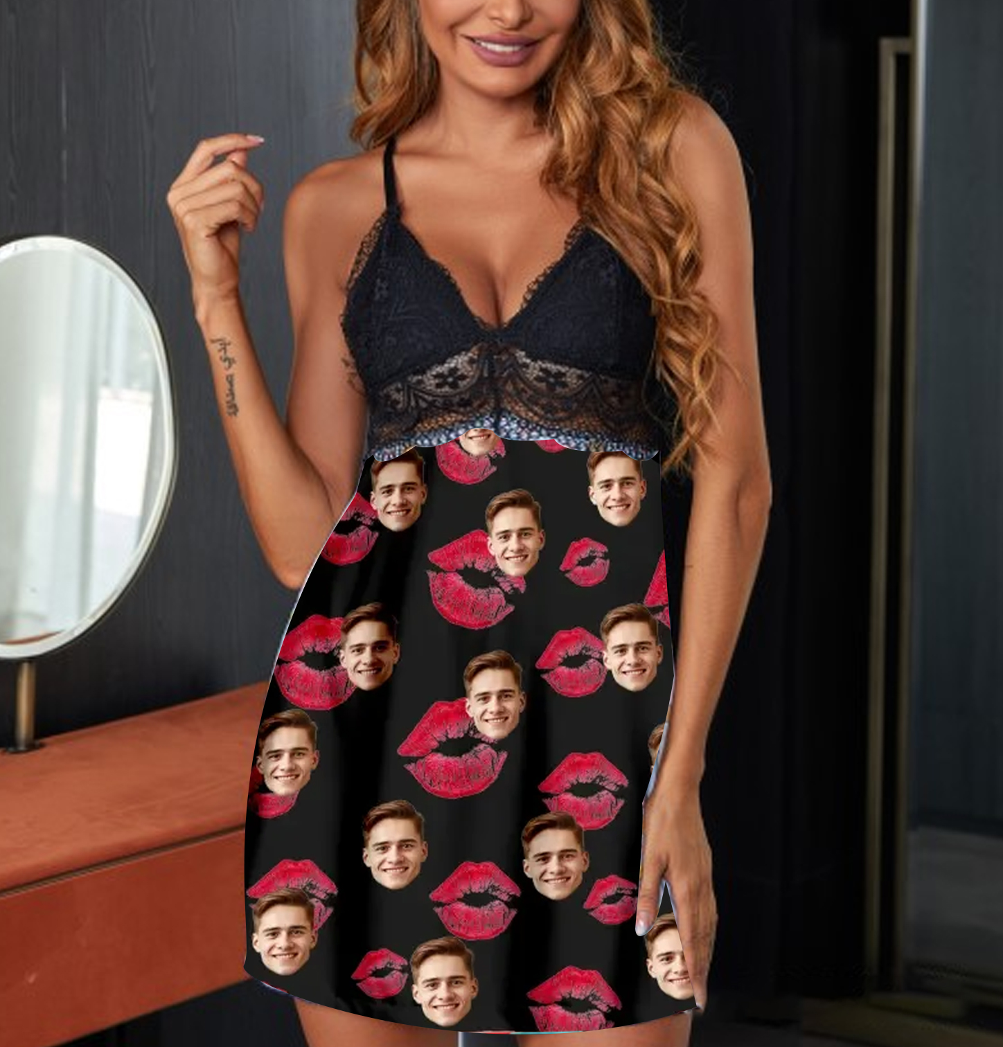 Custom Face Women Lace Suspender Sleepwear Personalized Lips V-neck Multi-Color Nightwear