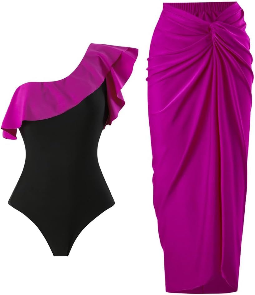Floralshe®Women's One Piece Swimsuit with Beach Cover up Wrap Skirt Sarong Retro Floral Print Bikini Set Two Piece Bathing Suit