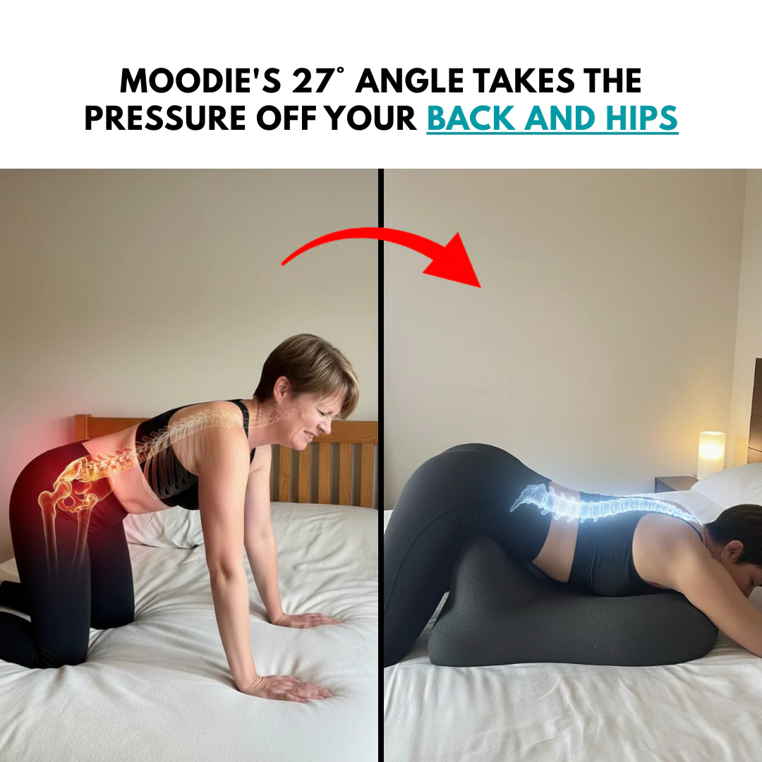 What makes the Moodie comfort Pillow different is its abilityto provide the exact 27-degree angle that redistributespressure, supports your spine, and creates comfortablepathways-addressing the actual source of pain whilerestoring intimate connection."