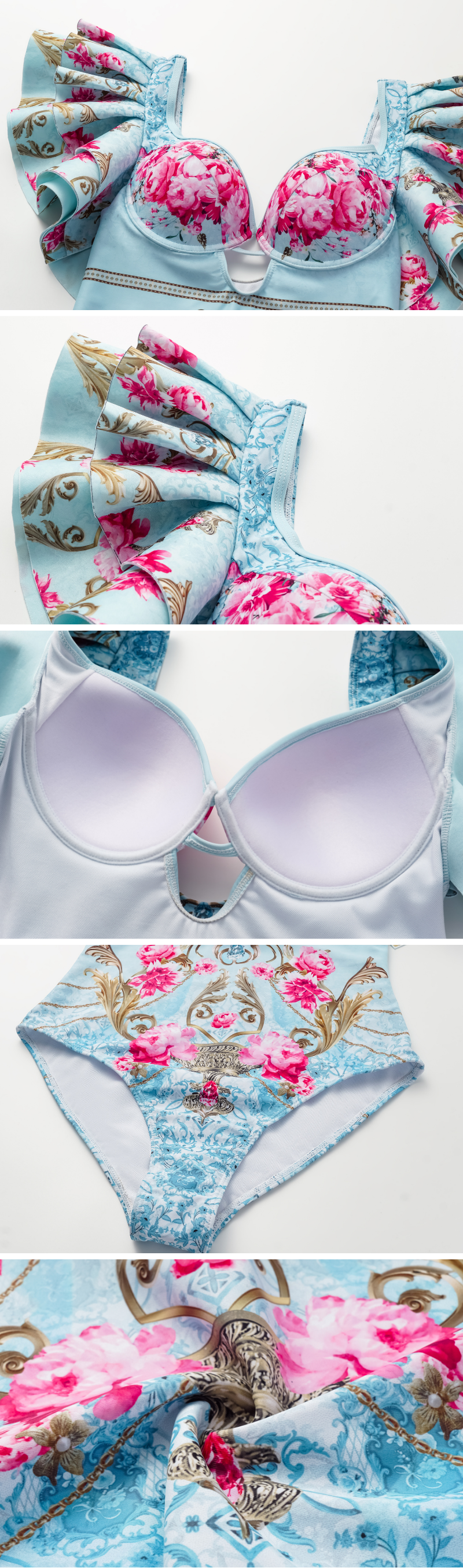 Ruffled Blue Blooming Flowers Print One Piece Swimsuit and Skirt