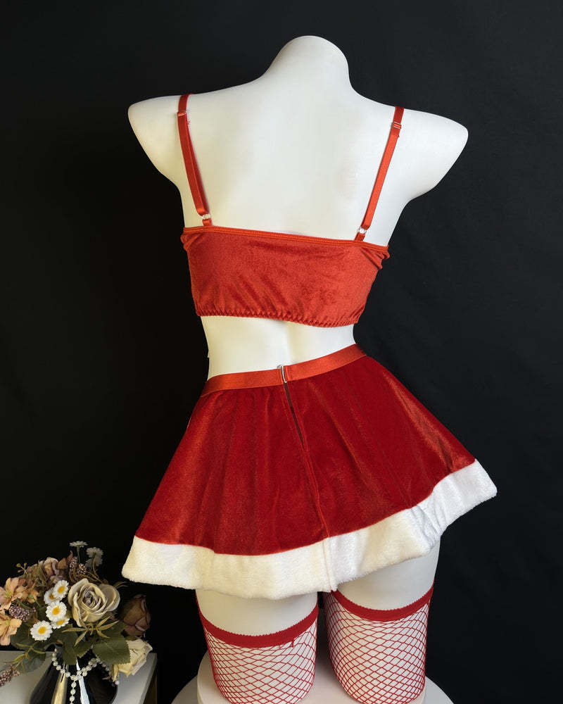 Embrace the festive spirit with a touch of daring charm in this Christmas-themed uniform set. Crafted from soft velvet and accented with a playful bow-tie, it blends classic holiday elegance with provocative style. Paired with sleek fishnet stockings, this ensemble is perfect for spreading joy and confidence this season.