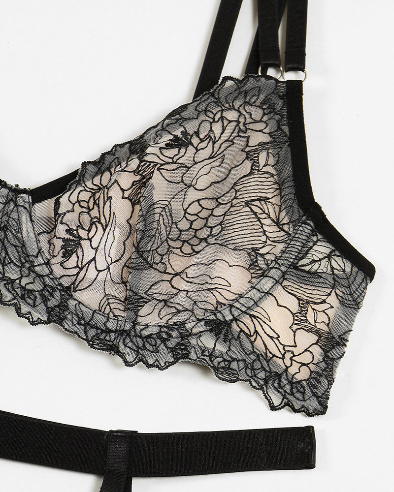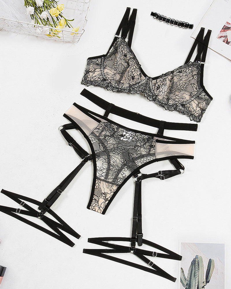 Sexy Flower Embroidered Mesh Splicing See-Through Lingerie Set