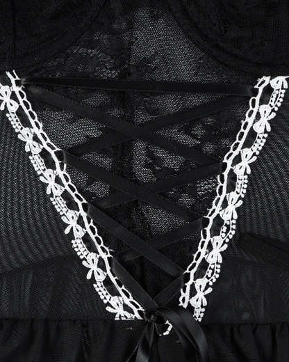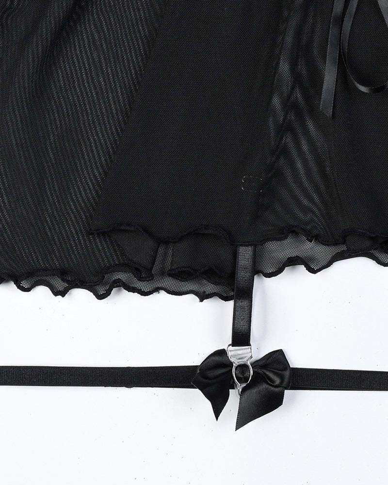 Sexy Lace Mesh See-Through Straps Cross Bow Mesh Ruffled Nightdress