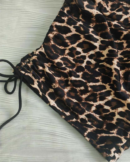 Vintage Leopard Print Adjustable Strap Swimsuit & Side Drawstring Swim Shorts Two-Piece Set