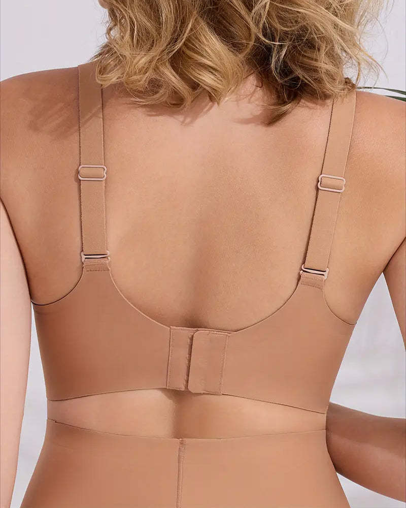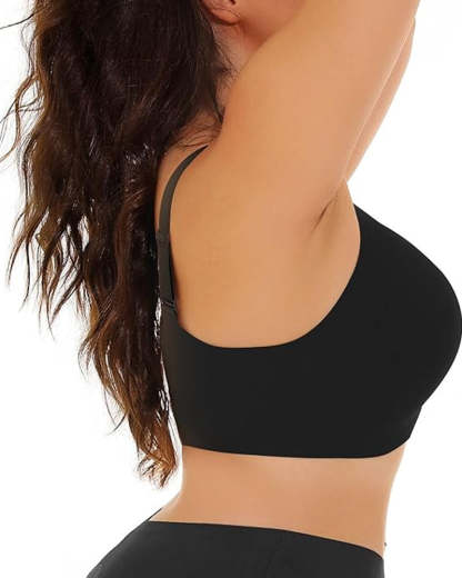 Experience all-day comfort in this buttery-soft seamless bra, designed for plus-size figures. The wire-free design with gentle gel lining offers natural lift and shape without the discomfort of underwire. Featuring a flattering V-neck with Y-strap detailing and full-coverage cups, it provides a smooth, invisible look under any outfit.